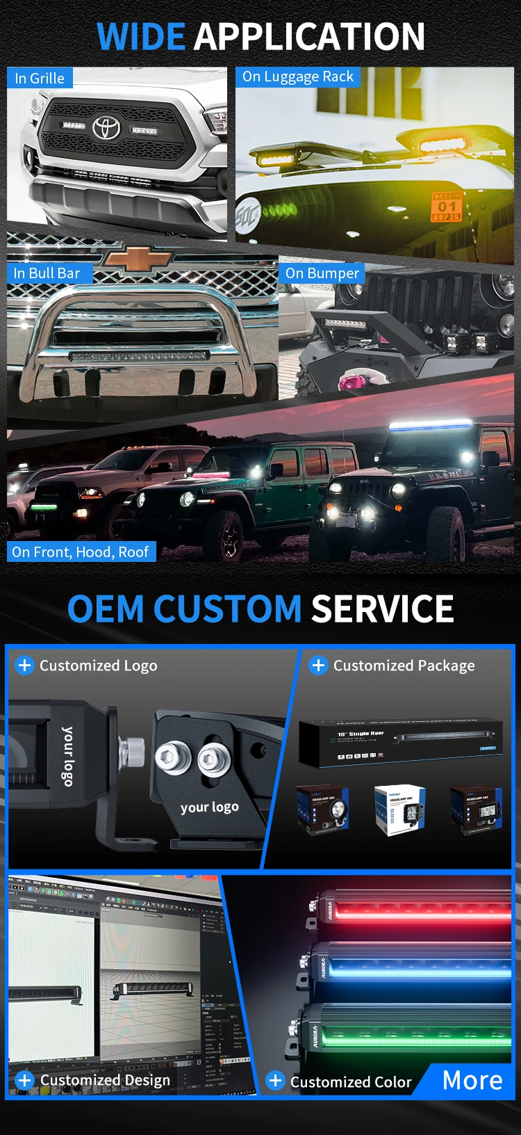 Фары Aurora подходят для квадроциклов, внедорожников, автомобилей, катеров, лодок, тракторов, комбайнов, погрузчиков и строительной техники. Отдельные серии с сертификатом IP69 предназначены для морских судов и лёгкой авиации.