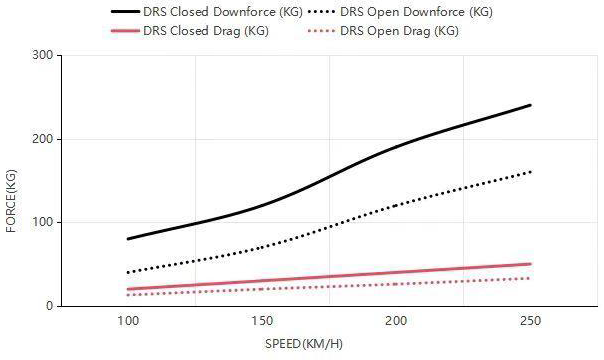 Аэродинамические показатели Максимальный прижим (DRS закрыт): 2800 Н Снижение сопротивления при открытом DRS: 30% Прирост максимальной скорости на прямой: +10 км/ч Улучшение прохождения средне- и высокоскоростных поворотов: +10% Высокоэффективный диапазон скоростей: 80–200 км/ч