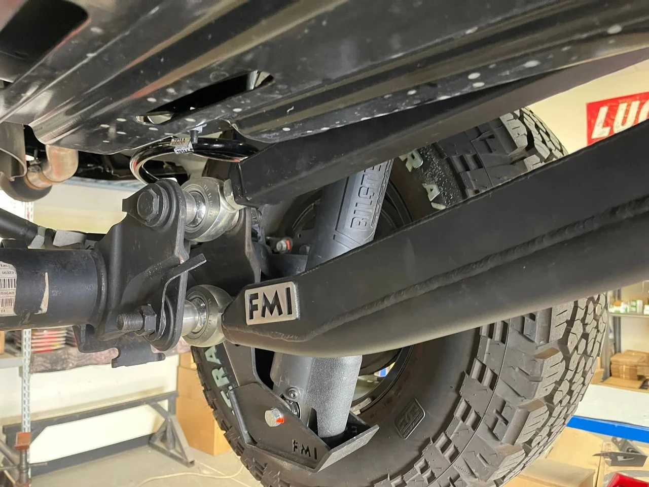 - 2 нижних регулируемых изготовленных тяги (trailing arms) FMI с универсальными шарнирами (uniball) 1,5" спереди и шаровыми шарнирами (rod ends) 1,25" на оси.