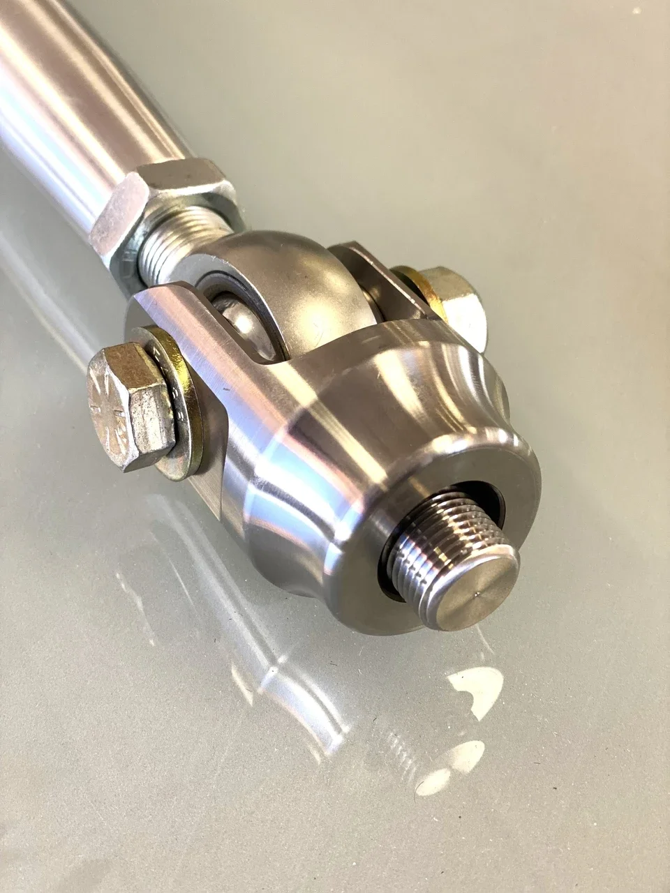 Со стороны рулевой рейки мы используем стальной клеммный адаптер из нержавеющей стали и шаровые шарниры FK диаметром 3/4 дюйма с проставками из нержавеющей стали 17-4, а также болты класса 8 и контргайки.